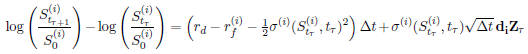 ここでZτ は標準の正規乱数の N×1 列ベクトルで,diはN×N の相関行列のコレスキー分解の i 番目の行です。言い換えれば didjT=ρ(i,j)(i,j=1,…,N)です。