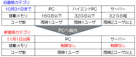1) 同時実行のユーザ数でカテゴリ分けを行う。(搭載メモリ容量制限の廃止)