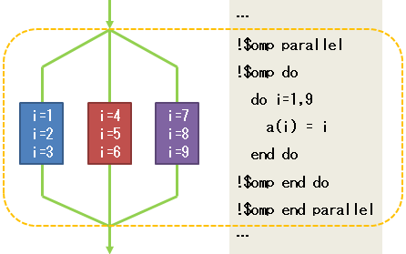 Fortranのdoループを複数のスレッドで実行するために、 OpenMPの do指示構文 が用意されています。 OpenMPのdo指示構文はその直後に指定されているdoループを並列化します。do指示構文は以下の書式を持ちます。