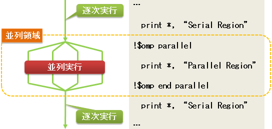 OpenMPの実行モデルは fork-join モデル と呼ばれるもので、 parallel指示構文で囲まれた並列領域のみが複数のスレッドにより並列実行され、 それ以外は一つのスレッドにより逐次実行されます。以下に参考図を示します。